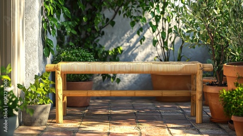 © ADD PHOTO, Obraz premium Cozy Bamboo Bench Surrounded by Green Plants