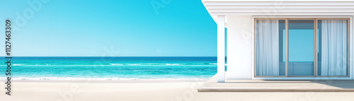 Fototapeta premium cozy beach house with white walls overlooks serene ocean view, creating...