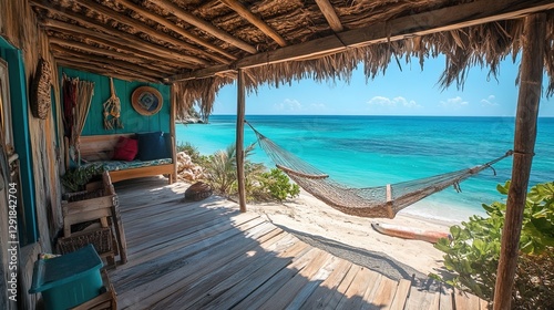 © Zahfran, Fototapeta premium Cozy beach hut with thatched roof, hammock, and view of the turquoise ocean