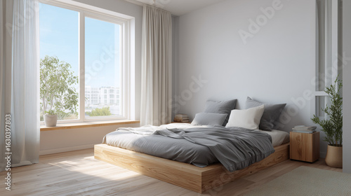 Obraz premium Cozy Bedroom Interior With Wooden Bed Frame And Natural Light From Large Window