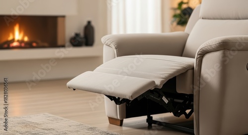 Naklejka premium Cozy beige recliner in modern living room with fireplace