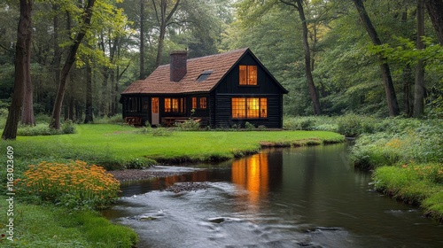 Obraz premium Cozy black cabin by serene stream surrounded by lush forest in early evening...