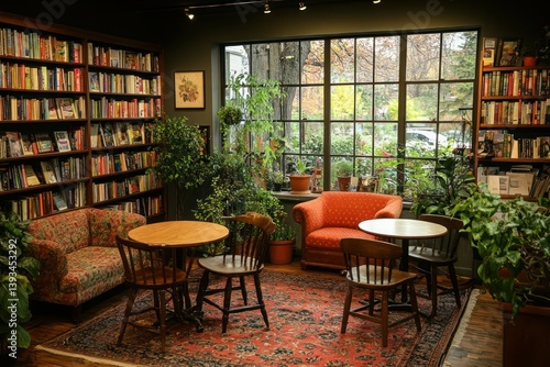 © Ika, Naklejka premium Cozy bookstore interior with comfortable seating areas, bookshelves, and plants