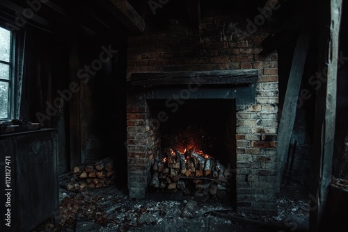 © trimiati, Obraz premium cozy brick fireplace in a dark room, inside there are logs