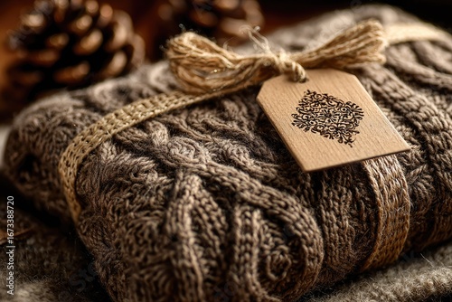 Fototapeta premium Cozy brown knit gift, rustic twine, wooden tag