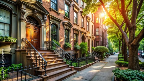 © Sirinporn, Fototapeta premium Cozy brownstone residential building with ornate stoop and historic architecture amidst vibrant greenery on a sun-drenched street in a classic New York City neighborhood.