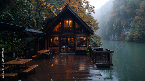 © BROPRADANA, Fototapeta premium Cozy cabin, autumn river, misty mountains, relaxing retreat