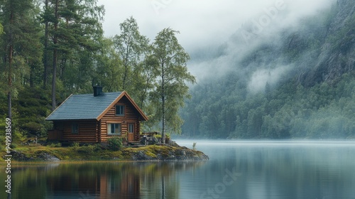 Fototapeta premium Cozy cabin by a serene lake surrounded by lush trees and misty atmosphere