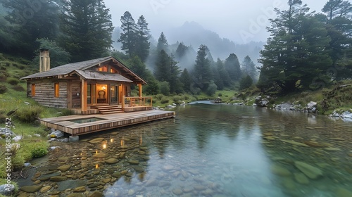 Naklejka premium Cozy cabin by a serene lake surrounded by misty mountains and lush forest