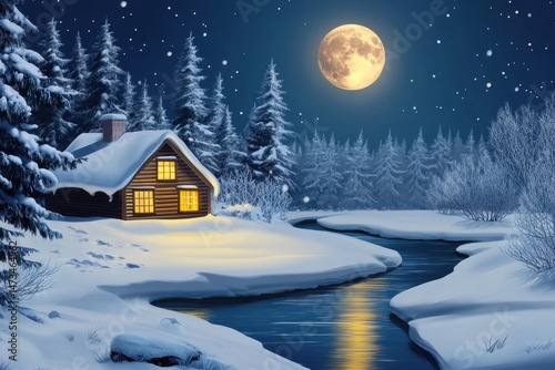 Naklejka premium Cozy cabin by a snowy river illuminated by a full moon with pine trees in the...