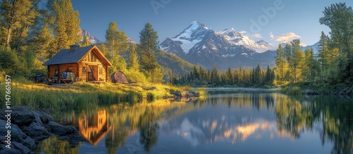 © Almahyra, Fototapeta premium Cozy cabin by a tranquil lake reflecting majestic mountains at sunrise.