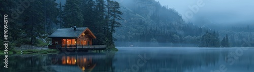 Fototapeta premium Cozy Cabin by the Lake in a Misty Forest at Dawn with Warm Lights and...