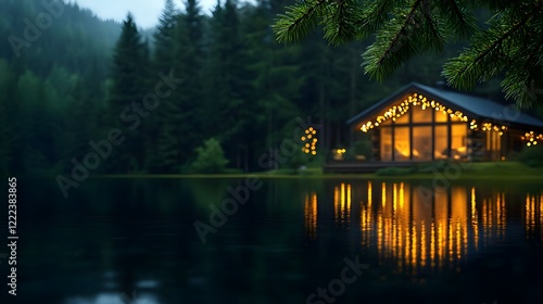 © Arthur Constantine, Obraz premium Cozy cabin by the serene lake with reflections and warm lights