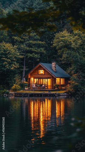 Obraz premium Cozy Cabin by Tranquil Lake Surrounded by Lush Forest at Dusk