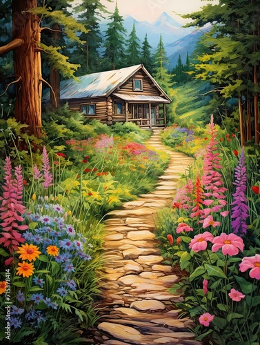 Fototapeta premium Cozy Cabin Getaways: Nature Walks on the Trail to Retreat With Serene Pathway Paintings