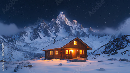 © Mlaku Banter, Fototapeta premium Cozy cabin glows, snowy mountain backdrop, night starscape; winter wonderland travel