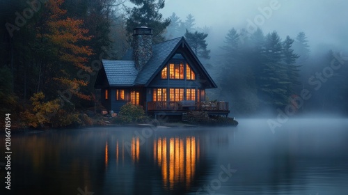 © Biancaart, Fototapeta premium Cozy Cabin Home Reflected on Misty Lake Waters at Twilight