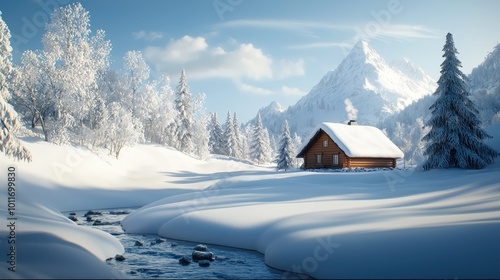 © amankris99, Naklejka premium Cozy Cabin in a Winter Wonderland Landscape