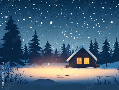 Fototapeta premium Cozy Cabin in Snowy Forest Under Starry Night Sky with Warm Lighted Windows