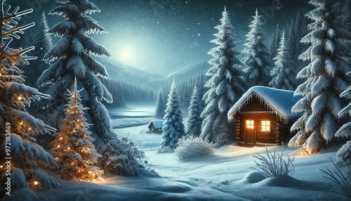 © Jeab, Fototapeta premium Cozy Cabin in Snowy Forest with Christmas Lights