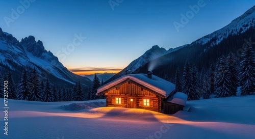 Fototapeta premium Cozy cabin in snowy mountain landscape at sunset