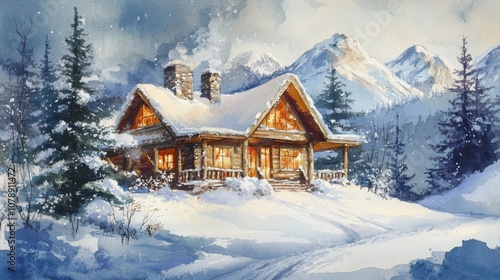 Naklejka premium Cozy cabin in snowy mountains, winter wonderland.