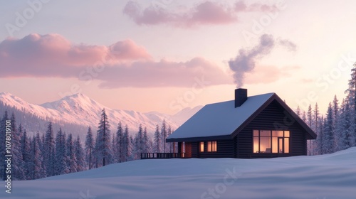 Fototapeta premium Cozy Cabin in the Snowy Mountains at Sunset.