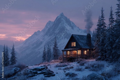 © Vladyslav, Fototapeta premium Cozy Cabin in the Snowy Mountains With Smoke Rising at Dusk Generative AI