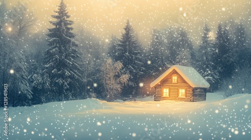 Fototapeta premium Cozy Cabin in Winter Wonderland: A small, inviting cabin nestled amidst snow-covered trees, radiating a warm glow during a serene snowfall, creating a tranquil, festive atmosphere.