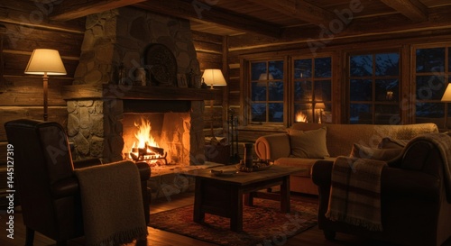 Fototapeta premium Cozy Cabin Interior with Fireplace and Warm Lighting at Night