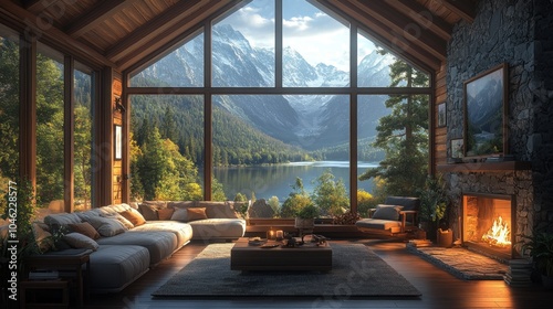 © Parsudi, Fototapeta premium Cozy cabin interior with mountain view and fireplace.