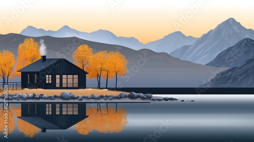 © Maz, Fototapeta premium Cozy cabin lake autumn mountains sunset reflection postcard