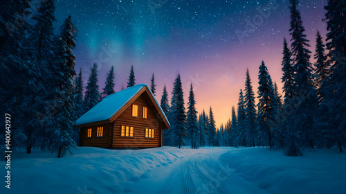 © Alfida, Naklejka premium Cozy cabin nestled in snowy forest under aurora borealis