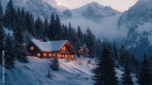 © Terablete, Fototapeta premium Cozy cabin nestled in snowy mountains at dusk with warm lights glowing through windows