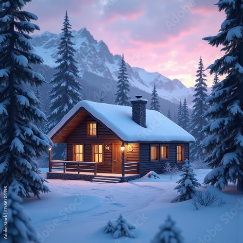 Naklejka premium cozy cabin nestled snowy mountainside winter landscape warmth serenity nature retreat, cottage, trees, wood, fireplace, snowflakes, ice, clouds, scenery, pine
