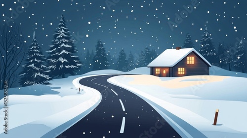 Fototapeta premium Cozy Cabin on Snowy Road at Night