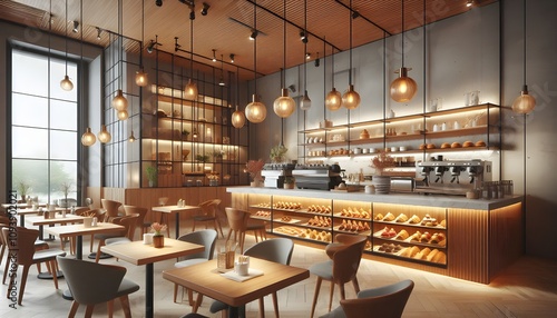 © Lens & Light, Obraz premium Cozy Café Interior with Hanging Lights and Counter Displaying Pastries