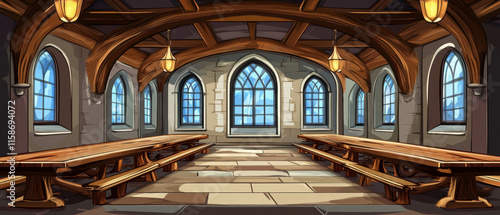 Obraz premium Cozy castle dining hall with long wooden tables and vintage lighting in a...