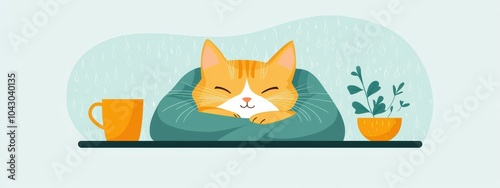 © Wanida, Fototapeta premium Cozy Cat Snuggled in Blanket on Rainy Day