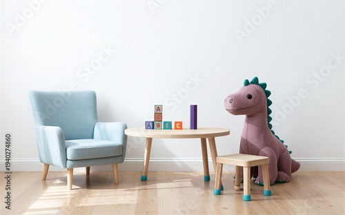 Fototapeta premium Cozy child's room with plush chair wooden table blocks and a friendly