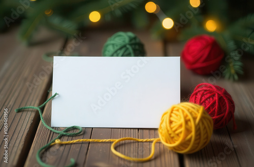 Obraz premium Cozy Christmas card with colorful yarn balls and festive lights on wooden table