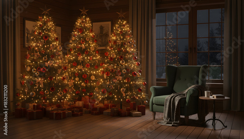 Naklejka premium Cozy Christmas evening with three glowing decorated trees