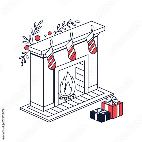 © Ashraf, Fototapeta premium Cozy christmas fireplace with stockings and gifts isometric illustration