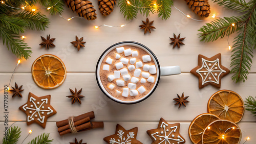 © rafe, Fototapeta premium Cozy christmas flat lay featuring a mug of hot chocolate with marshmallows surrounded by festive decorations and treats
