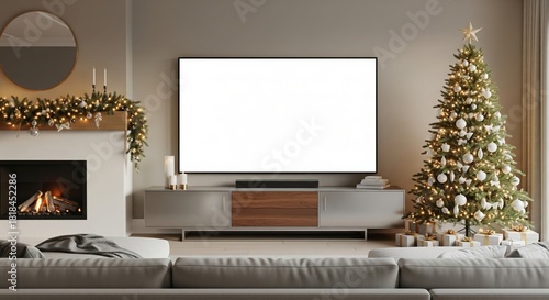 © YUSUF, Naklejka premium Cozy Christmas living room interior with a beautifully decorated festive tree, a warm fireplace, comfortable sofa, and a blank television screen mockup for seasonal digital content display