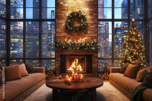 Obraz premium Cozy Christmas living room with a fireplace and city view at night, digital...