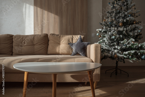© thayra83, Fototapeta premium Cozy Christmas Living Room with Decorated Tree and Gifts