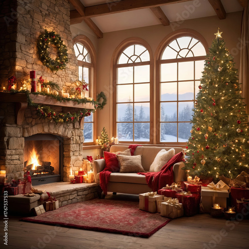 © Vitalii, Fototapeta premium Cozy Christmas living room with decorated tree and glowing fireplace