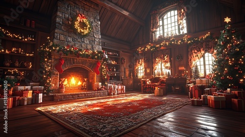 Obraz premium Cozy Christmas living room with fireplace and decorated trees