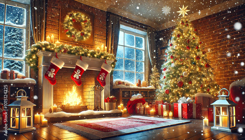 Obraz premium Cozy Christmas Living Room with Warm Fireplace and Decorated Tree. AI-generated